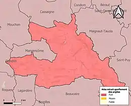 Le retrait-gonflement des sols argileux est susceptible d'engendrer des dommages importants aux bâtiments en cas d’alternance de périodes de sécheresse et de pluie. La totalité de la commune est en aléa moyen ou fort (94,5 % au niveau départemental et 48,5 % au niveau national). Sur les 676 bâtiments dénombrés sur la commune en 2019, 674 sont en aléa moyen ou fort, soit 100 %, à comparer aux 93 % au niveau départemental et 54 % au niveau national. Une cartographie de l'exposition du territoire national au retrait gonflement des sols argileux est disponible sur le site du BRGM[23],[Carte 3].
