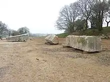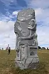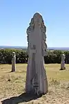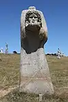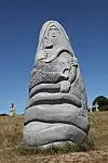 | 31 | Cornély | 2013 | Goulven Jaouen | Statue de 3 m et de 10 t en granit bleu de Plouigneau. Selon sa légende dorée, Cornély, pape à Rome, était poursuivi par des légionnaires de l'empereur romain Trébonien Galle. Dans son chariot tiré par deux bœufs, il fut acculé devant l'océan. Il se cacha dans l'oreille d'un bœuf et transforma ses ennemis en pierre. Telle serait l'origine des alignements de Carnac. Ses attributs ici sont la tiare pontificale, deux têtes de bœufs sur le torse, et la main levée face à ses poursuivants[70]. | ![]() |