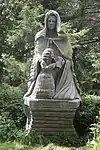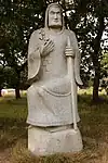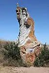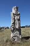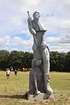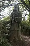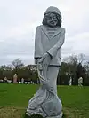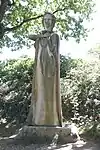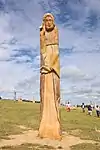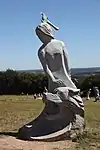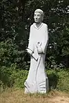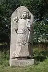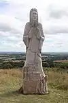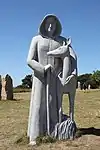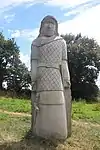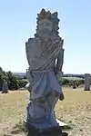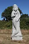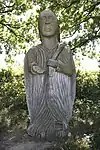| 51 | Eodez[91] | 2015 | Didier Hardellet | Statue de 4,20 m en granit bleu de Lanhélin. Haude, ou Eodez, sainte céphalophore victime des accusations de mauvaise conduite portées contre elle par une marâtre jalouse, elle est décapitée par son frère Tanguy. Lorsque ce dernier va confesser son crime à ses parents, Eodez revient au château familial, sa tête entre les mains. La marâtre est foudroyée par la tonnerre et mordue par un serpent tandis que la sainte reçoit les derniers sacrements[92]. | ![]() |