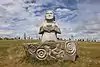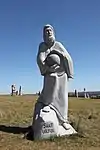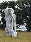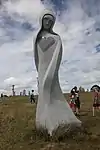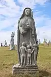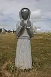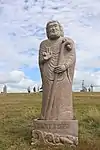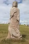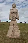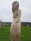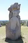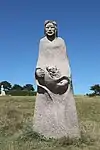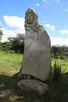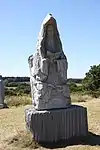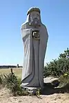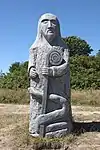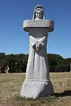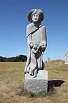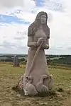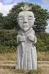 | 28 | Gwenn | 2013 | Patrice Le Guen | Statue de 4 m et 12 t en granit jaune aurore de Bignan (granit beige à grains fins et moyens de couleur jaune et gris-jaune). Les trois seins (motif de la polymastie) et les triplés sont ses attributs iconographiques. Selon la légende, Dieu lui aurait accordé un troisième sein pour pouvoir allaiter ses triplés (Guethenoc, Jacut et Guénolé), d'où son surnom breton « santez Gwenn Teir Bronn », littéralement « sainte Gwenn aux trois seins »[68]. Clin d'œil du sculpteur, il fait apparaître des rondeurs qui suggèrent qu'elle est enceinte de son quatrième enfant, Clervie[69]. Protectrice des enfants, elle est invoquée par les mères manquant de lait et est la patronne des nourrices. | ![]() |