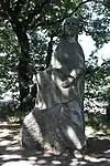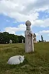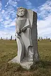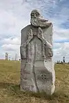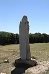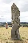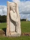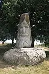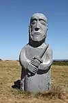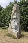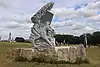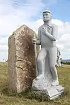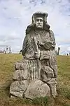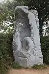 | 14 | Hervé | 2011 | Jacques Dumas | Statue d'Hervé (Horane en breton) de 3,50 m et de 8 t en granit bleu de Lanhélin. Sur le dos de ce saint, patron des bardes et des poètes, est gravé « Hervé vécut en compagnie de son guide, le jeune Guic’haran et d’un loup apprivoisé ». Dumas représente le saint appuyé sur son bâton d'aveugle[59], et conduit par un loup domestiqué. Le bandeau sur les yeux du canidé rappelle que c'est lui qui est guidé par le saint, aveugle de naissance et qui est devenu un « voyant » à la dent lumineuse (motif hagiographique renvoyant au rite incantatoire païen du teinn laegda[60] issu de la mythologie celtique)[61]. | ![]() |