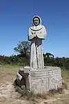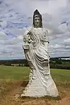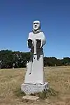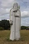 | 55 | Gonery | 2015 | David Puech | Statue de 4,30 m en granit jaune aurore de Bignan (granit beige à grains fins et moyens de couleur jaune et gris-jaune), le socle étant en granit blanc de Huelgoat (socle). Saint dont les miracles provoquèrent un afflux de pèlerins, le contraignant à fuir pour trouver la solitude[97]. | ![]() |