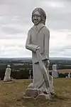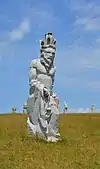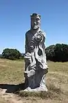 | 42 | Jaoua | 2014 | Goulven Jaouen | Statue de 3,70 m en granit gris-bleu de Louvigné-du-Désert (granit d'aspect moucheté et de couleur gris-bleuâtre. Paragenèse : quartz gris, feldspath blanc et mica noir). Jaoua mourut à Brasparts, dont il était le recteur, mais, selon la légende, les deux bœufs qui tiraient son char funèbre amenèrent la dépouille du saint jusqu'à l'emplacement de la chapelle à Plouvien. Version délicate pour évoquer un vol probable des reliques, celles-ci attirant les pèlerins et donc les aumônes[80]. | ![]() |