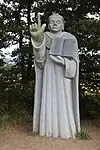 | 2 | Brieuc[48] | 2009 | Fabrice Lentz | Statue de 3,50 m en granit de Saint-Carreuc. Selon la légende, alors qu'il regagne le soir son monastère avec plusieurs compagnons, ils sont cernés par une horde de loups menaçants qui se disposent en cercle autour d'eux. Il suffit que Brieuc lève la main pour que les loups se dispersent tranquillement et cessent d'inquiéter le groupe. C'est pourquoi le loup est son attribut iconographique, la crosse épiscopale lui donnant une dignité d'évêque[49] qu'il n'a jamais eue[50]. | ![]() |