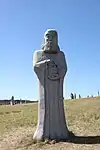 | 49 | Thuriau | 2014 | Philippe Leost | Statue de 3,80 m et 10 t en granit bleu de Lanhélin. Saint Turiau fut d'abord berger. Un prêtre fit son instruction, ce qui lui permit de devenir prêtre à son tour et d'être adopté par saint Samson, évêque de Dol, auquel il succéda. La statue, tel un gisant, le figure en berger couché dans les pâtures, son canotier sur un de ses pieds croisé, gardant les moutons en lisant la bible[27]. | ![]() |