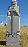 | 19 | Théleau[62] | 2011 | Bruno Panas | Statue de 3,50 m en granit gris-bleu de Louvigné-du-Désert (carrière Godard). Le saint est représenté à cheval sur un cerf, sous un chêne. Cette iconographie correspond à la légende selon laquelle il protégea un cerf de la meute de chiens du domaine de Kastell Gall. Une autre légende rapporte qu’un seigneur de Châteaugal offrit à l’ermite le territoire qu’il pourrait enclore en une nuit, avant le chant du coq ; le saint se servit d’un cerf comme monture. Théleau est une survivance populaire du christianisme celtique, le cerf étant en liaison avec le dieu Cernunnos et le chêne étant l'arbre des druides[63]. | ![]() |