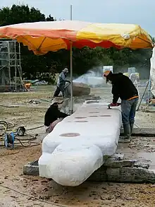 La phase de réalisation a commencé dès avec la taille des statues des Sept saints fondateurs de la Bretagne et de celle de saint Yves de Tréguier (capitale d'évêché particulière car ayant un saint fondateur et un saint patron[réf. nécessaire]). Les sept statues (3 mètres de haut, et de 6 à 12 tonnes environ) représentant les saints fondateurs de Bretagne (Paul ou Pol Aurélien, Tugdual de Tréguier, Brieuc, Samson de Dol, Malo, Patern de Vannes et Corentin de Quimper) ont été érigées sur un lieu d'accueil temporaire, dans le centre-ville de Saint-Pol-de-Léon, à proximité de la cathédrale. Cette érection a eu lieu le [14]. Ils sont ensuite placés autour de la motte castrale de Saint-Gildas (en breton Tossen Sant Gweltas), butte qui offre un panorama à 360° sur le Poher (clochers des communes, monts d'Arrée et l'antenne du Roc'h Trédudon, montagnes Noires, rade de Brest par temps clair)[15]. Cette motte circulaire qui date de la fin du Xe siècle était une grande enceinte circulaire formée de rejets de terre considérables et de fossés de 7 m de profondeur[16].