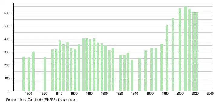 L'évolution du nombre d'habitants est connue à travers les recensements de la population effectués dans la commune depuis 1793. Pour les communes de moins de 10 000 habitants, une enquête de recensement portant sur toute la population est réalisée tous les cinq ans, les populations légales des années intermédiaires étant quant à elles estimées par interpolation ou extrapolation[23]. Pour la commune, le premier recensement exhaustif entrant dans le cadre du nouveau dispositif a été réalisé en 2007[24].