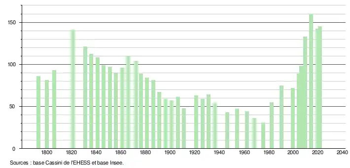 L'évolution du nombre d'habitants est connue à travers les recensements de la population effectués dans la commune depuis 1793. Pour les communes de moins de 10 000 habitants, une enquête de recensement portant sur toute la population est réalisée tous les cinq ans, les populations légales des années intermédiaires étant quant à elles estimées par interpolation ou extrapolation[17]. Pour la commune, le premier recensement exhaustif entrant dans le cadre du nouveau dispositif a été réalisé en 2004[18].