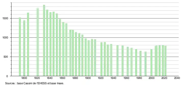 L'évolution du nombre d'habitants est connue à travers les recensements de la population effectués dans la commune depuis 1793. Pour les communes de moins de 10 000 habitants, une enquête de recensement portant sur toute la population est réalisée tous les cinq ans, les populations légales des années intermédiaires étant quant à elles estimées par interpolation ou extrapolation[17]. Pour la commune, le premier recensement exhaustif entrant dans le cadre du nouveau dispositif a été réalisé en 2007[18].