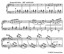 L’œuvre est dans la tonalité principale de fa mineur, tempo di valzer moderato, et « témoigne de l'amour du jeune compositeur pour Chopin et Borodine[2] ». Dans la première partie, des « volutes aériennes [...] ponctuent les phrases mélodiques et introduisent une dissymétrie dans les carrures[4] ». La partie centrale utilise le mode lydien (sol bécarre en bémol majeur[2]) et la conclusion, « robuste [...], avec son ample crescendo[3] », est en fa majeur et n'est pas sans évoquer celle du Prélude de la Suite bergamasque[2].