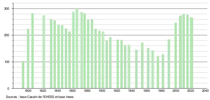 L'évolution du nombre d'habitants est connue à travers les recensements de la population effectués dans la commune depuis 1793. Pour les communes de moins de 10 000 habitants, une enquête de recensement portant sur toute la population est réalisée tous les cinq ans, les populations légales des années intermédiaires étant quant à elles estimées par interpolation ou extrapolation[22]. Pour la commune, le premier recensement exhaustif entrant dans le cadre du nouveau dispositif a été réalisé en 2005[23].