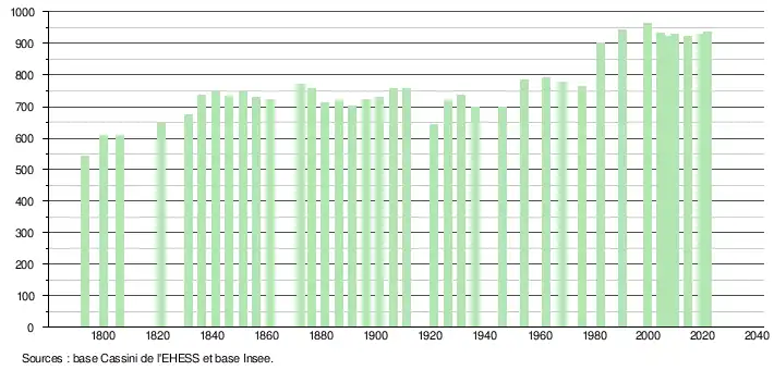 L'évolution du nombre d'habitants est connue à travers les recensements de la population effectués dans la commune depuis 1793. Pour les communes de moins de 10 000 habitants, une enquête de recensement portant sur toute la population est réalisée tous les cinq ans, les populations légales des années intermédiaires étant quant à elles estimées par interpolation ou extrapolation[32]. Pour la commune, le premier recensement exhaustif entrant dans le cadre du nouveau dispositif a été réalisé en 2004[33].