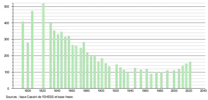 | L'évolution du nombre d'habitants est connue à travers les recensements de la population effectués dans la commune depuis 1793. Pour les communes de moins de 10 000 habitants, une enquête de recensement portant sur toute la population est réalisée tous les cinq ans, les populations légales des années intermédiaires étant quant à elles estimées par interpolation ou extrapolation[20]. Pour la commune, le premier recensement exhaustif entrant dans le cadre du nouveau dispositif a été réalisé en 2006[21]. En 2021, la commune comptait 163 habitants[Note 3], en augmentation de 10,14 % par rapport à 2015 (Eure : −0,5 %, France hors Mayotte : +1,84 %). |
