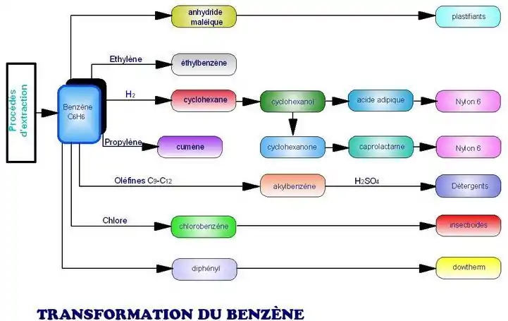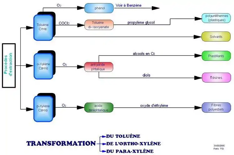 Tous les composés aromatiques, une fois extraits et purifiés, servent de matières premières pour d'autres réactions d'hydrogénation ou d'oxydation afin de conduire à des plastifiants, des solvants, des fibres, des insecticides et bien d'autres produits. On peut voir ci-après les différents schémas de transformations du benzène, du cumène, du toluène et des xylènes ortho et para.