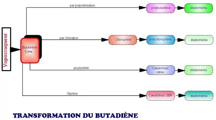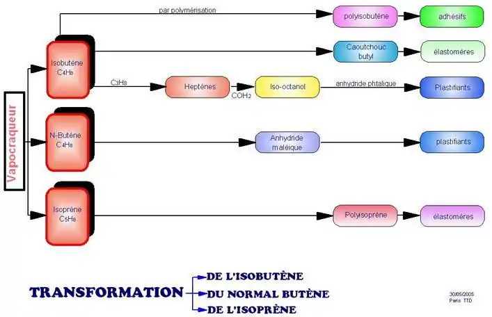 À la sortie du vapocraqueur, on obtient surtout des oléfines telles que l'éthylène, le propylène, le butadiène, l'isobutène, le n-butène et l'isoprène. Ce sont des produits intermédiaires qui, par des traitements appropriés (chloration, oxydation, polymérisation, etc.) donnent naissance à toute une gamme de produits nouveaux. Les schémas ci-après montrent toutes les possibilités de fabrications à partir de ces grands intermédiaires.