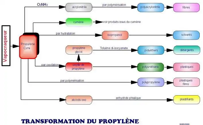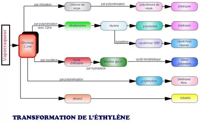 L'éthylène issu du vapocraquage est utilisé dans la fabrication de chlorure de vinyle (VC), de l'éthylbenzène, de l'oxyde d'éthylène et de l'éthanol. À partir du chlorure de vinyle, on fabrique par polymérisation du polyvinyle chlorure (PVC), matière plastique aux multiples usages : tuyauterie plastique, le bâtiment, l'ameublement, les bouteilles plastiques, l'habillement etc.