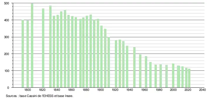 L'évolution du nombre d'habitants est connue à travers les recensements de la population effectués dans la commune depuis 1793. Pour les communes de moins de 10 000 habitants, une enquête de recensement portant sur toute la population est réalisée tous les cinq ans, les populations légales des années intermédiaires étant quant à elles estimées par interpolation ou extrapolation[15]. Pour la commune, le premier recensement exhaustif entrant dans le cadre du nouveau dispositif a été réalisé en 2007[16].