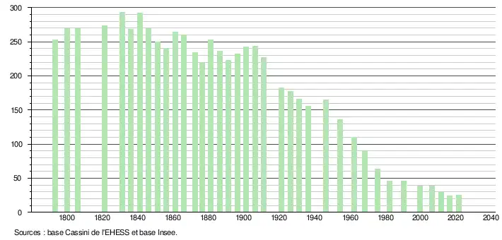 L'évolution du nombre d'habitants est connue à travers les recensements de la population effectués dans la commune depuis 1793. Pour les communes de moins de 10 000 habitants, une enquête de recensement portant sur toute la population est réalisée tous les cinq ans, les populations légales des années intermédiaires étant quant à elles estimées par interpolation ou extrapolation[18]. Pour la commune, le premier recensement exhaustif entrant dans le cadre du nouveau dispositif a été réalisé en 2006[19].