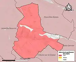 Le retrait-gonflement des sols argileux est susceptible d'engendrer des dommages importants aux bâtiments en cas d’alternance de périodes de sécheresse et de pluie. 94 % de la superficie communale est en aléa moyen ou fort (88,8 % au niveau départemental et 48,5 % au niveau national). Sur les 110 bâtiments dénombrés sur la commune en 2019, 101 sont en aléa moyen ou fort, soit 92 %, à comparer aux 98 % au niveau départemental et 54 % au niveau national. Une cartographie de l'exposition du territoire national au retrait gonflement des sols argileux est disponible sur le site du BRGM[24],[Carte 3].