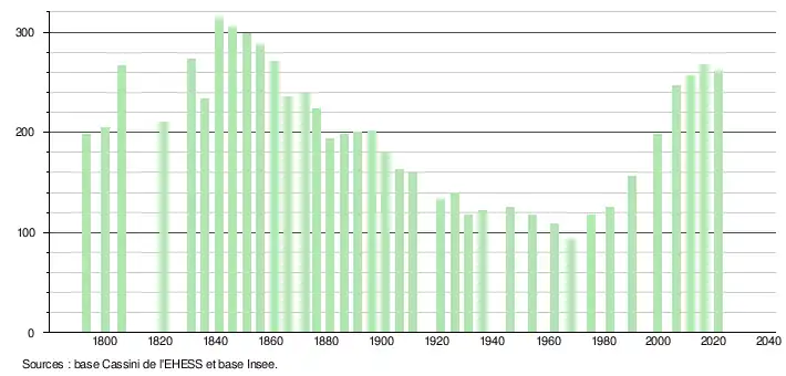 L'évolution du nombre d'habitants est connue à travers les recensements de la population effectués dans la commune depuis 1793. Pour les communes de moins de 10 000 habitants, une enquête de recensement portant sur toute la population est réalisée tous les cinq ans, les populations légales des années intermédiaires étant quant à elles estimées par interpolation ou extrapolation[34]. Pour la commune, le premier recensement exhaustif entrant dans le cadre du nouveau dispositif a été réalisé en 2006[35].