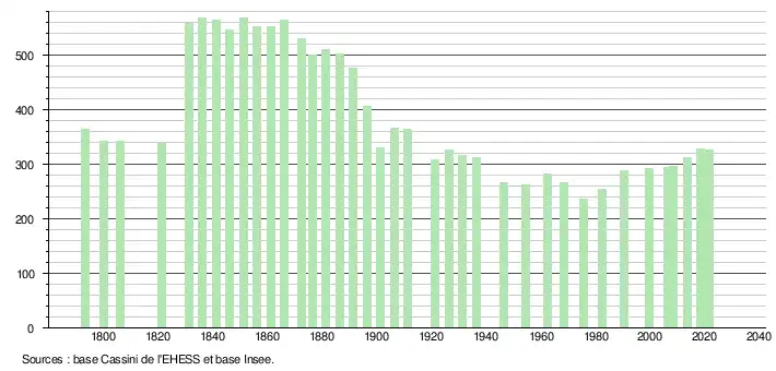 L'évolution du nombre d'habitants est connue à travers les recensements de la population effectués dans la commune depuis 1793. Pour les communes de moins de 10 000 habitants, une enquête de recensement portant sur toute la population est réalisée tous les cinq ans, les populations légales des années intermédiaires étant quant à elles estimées par interpolation ou extrapolation[18]. Pour la commune, le premier recensement exhaustif entrant dans le cadre du nouveau dispositif a été réalisé en 2008[19].