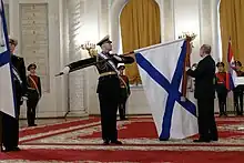 Le président russe Vladimir Poutine attache l'Ordre de Nakhimov à l'enseigne du croiseur lance-missiles Varyag, le 23 février 2018.