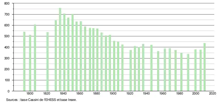 - Dans le tableau des recensements et le graphique, par convention dans Wikipédia, le principe a été retenu, pour les populations légales postérieures à 1999 de n’afficher dans le tableau des recensements et le graphique que les populations correspondant à l'année 2006, première population légale publiée calculée conformément aux concepts définis dans le décret no 2003-485 du 5 juin 2003, et les années correspondant à une enquête exhaustive de recensement pour les communes de moins de 10 000 habitants, ainsi que la dernière population légale publiée par l’Insee.