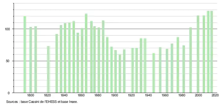 L'évolution du nombre d'habitants est connue à travers les recensements de la population effectués dans la commune depuis 1793. Pour les communes de moins de 10 000 habitants, une enquête de recensement portant sur toute la population est réalisée tous les cinq ans, les populations légales des années intermédiaires étant quant à elles estimées par interpolation ou extrapolation[3]. Pour la commune, le premier recensement exhaustif entrant dans le cadre du nouveau dispositif a été réalisé en 2006[4].