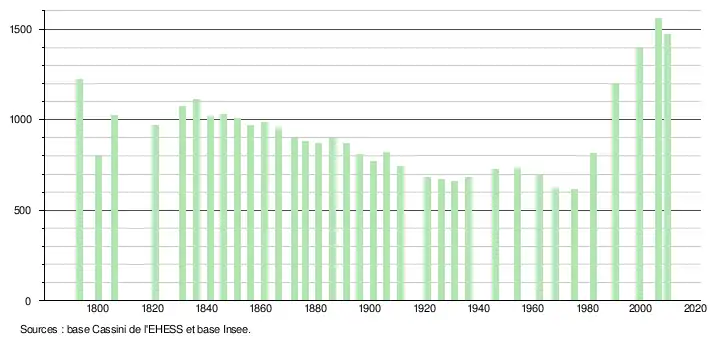 L'évolution du nombre d'habitants est connue à travers les recensements de la population effectués dans la commune depuis 1793. À partir du , les populations légales des communes sont publiées annuellement dans le cadre d'un recensement qui repose désormais sur une collecte d'information annuelle, concernant successivement tous les territoires communaux au cours d'une période de cinq ans. Pour les communes de moins de 10 000 habitants, une enquête de recensement portant sur toute la population est réalisée tous les cinq ans, les populations légales des années intermédiaires étant quant à elles estimées par interpolation ou extrapolation[12]. Pour la commune, le premier recensement exhaustif entrant dans le cadre du nouveau dispositif a été réalisé en 2004[13],[Note 1].