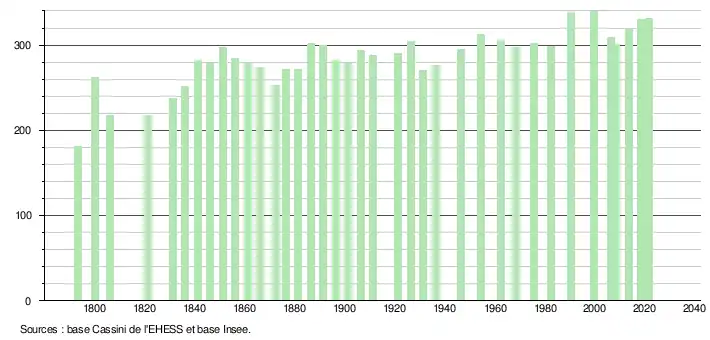 L'évolution du nombre d'habitants est connue à travers les recensements de la population effectués dans la commune depuis 1793. Pour les communes de moins de 10 000 habitants, une enquête de recensement portant sur toute la population est réalisée tous les cinq ans, les populations légales des années intermédiaires étant quant à elles estimées par interpolation ou extrapolation[19]. Pour la commune, le premier recensement exhaustif entrant dans le cadre du nouveau dispositif a été réalisé en 2008[20].