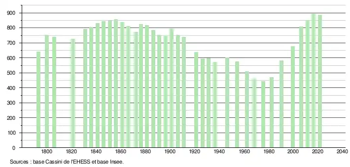 L'évolution du nombre d'habitants est connue à travers les recensements de la population effectués dans la commune depuis 1793. Pour les communes de moins de 10 000 habitants, une enquête de recensement portant sur toute la population est réalisée tous les cinq ans, les populations légales des années intermédiaires étant quant à elles estimées par interpolation ou extrapolation[44]. Pour la commune, le premier recensement exhaustif entrant dans le cadre du nouveau dispositif a été réalisé en 2006[45].