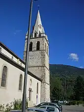 - Église Saint-Jean-Baptiste. La présence d'une église est attestée dès le XIe siècle à son emplacement actuel. L'église primitive était organisée selon un plan classique en croix latine, les plafonds de la nef et du transept étant lambrissés, le plancher en bois et le toit couvert d’ardoise. L’aspect qu’on lui connaît de nos jours est le résultat d’importantes transformations réalisées au cours des siècles. Le clocher daterait du XVe siècle[45] mais il est alors coiffé d’une flèche en bois. En 1699, le chœur est maçonné selon le style roman en « cul de four ». Puis entre 1728 et 1731, c’est la flèche du clocher qui est rebâtie en pierre, sur le modèle du clocher de l’église Saint-André de Grenoble. Ces deux éléments, chœur et clocher, sont les parties les plus anciennes encore visibles. En effet, d’importants travaux réalisés entre 1865 et 1868 modifient considérablement la structure originelle du bâtiment : l’ancienne église est rasée jusqu’au chœur, une nouvelle nef est bâtie, flanquée de deux bas côtés, donnant ainsi plus d'espace aux paroissiens. Le toit reçoit alors sa couverture de tuile tandis qu’à l’intérieur le sol est recouvert de carreaux de ciment. Autre curiosité, dans le chœur, le maître-autel (milieu XVIIIe siècle), classé aux monuments historiques, provient probablement de la Chartreuse de Prémol.