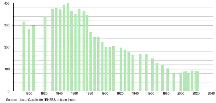 L'évolution du nombre d'habitants est connue à travers les recensements de la population effectués dans la commune depuis 1793. Pour les communes de moins de 10 000 habitants, une enquête de recensement portant sur toute la population est réalisée tous les cinq ans, les populations légales des années intermédiaires étant quant à elles estimées par interpolation ou extrapolation[33]. Pour la commune, le premier recensement exhaustif entrant dans le cadre du nouveau dispositif a été réalisé en 2004[34].