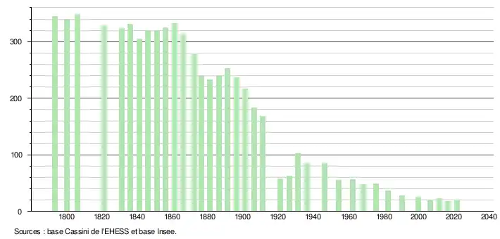 L'évolution du nombre d'habitants est connue à travers les recensements de la population effectués dans la commune depuis 1793. Pour les communes de moins de 10 000 habitants, une enquête de recensement portant sur toute la population est réalisée tous les cinq ans, les populations légales des années intermédiaires étant quant à elles estimées par interpolation ou extrapolation[15]. Pour la commune, le premier recensement exhaustif entrant dans le cadre du nouveau dispositif a été réalisé en 2006[16].