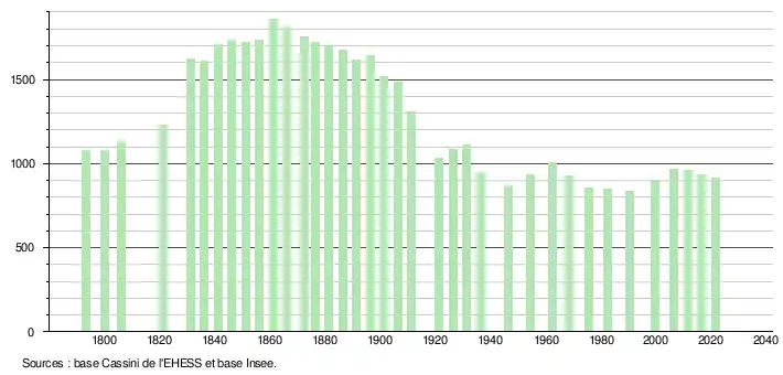 L'évolution du nombre d'habitants est connue à travers les recensements de la population effectués dans la commune depuis 1793. Pour les communes de moins de 10 000 habitants, une enquête de recensement portant sur toute la population est réalisée tous les cinq ans, les populations légales des années intermédiaires étant quant à elles estimées par interpolation ou extrapolation[21]. Pour la commune, le premier recensement exhaustif entrant dans le cadre du nouveau dispositif a été réalisé en 2006[22].