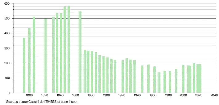 L'évolution du nombre d'habitants est connue à travers les recensements de la population effectués dans la commune depuis 1793. Pour les communes de moins de 10 000 habitants, une enquête de recensement portant sur toute la population est réalisée tous les cinq ans, les populations légales des années intermédiaires étant quant à elles estimées par interpolation ou extrapolation[20]. Pour la commune, le premier recensement exhaustif entrant dans le cadre du nouveau dispositif a été réalisé en 2008[21].