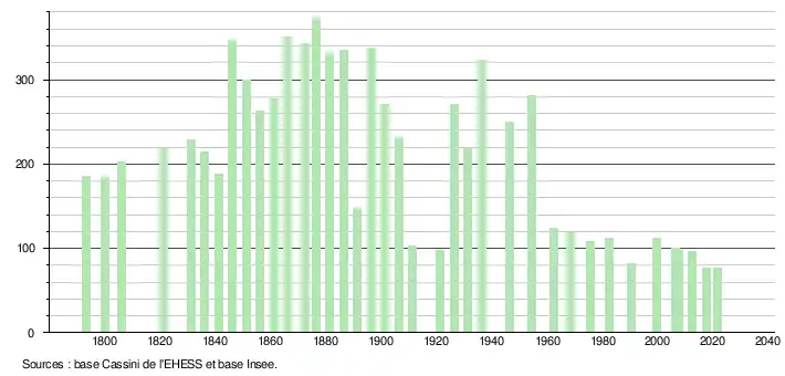 L'évolution du nombre d'habitants est connue à travers les recensements de la population effectués dans la commune depuis 1793. Pour les communes de moins de 10 000 habitants, une enquête de recensement portant sur toute la population est réalisée tous les cinq ans, les populations légales des années intermédiaires étant quant à elles estimées par interpolation ou extrapolation[15]. Pour la commune, le premier recensement exhaustif entrant dans le cadre du nouveau dispositif a été réalisé en 2007[16].
