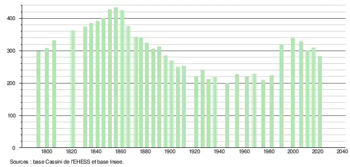 L'évolution du nombre d'habitants est connue à travers les recensements de la population effectués dans la commune depuis 1793. Pour les communes de moins de 10 000 habitants, une enquête de recensement portant sur toute la population est réalisée tous les cinq ans, les populations légales des années intermédiaires étant quant à elles estimées par interpolation ou extrapolation[24]. Pour la commune, le premier recensement exhaustif entrant dans le cadre du nouveau dispositif a été réalisé en 2006[25].