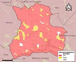 Le retrait-gonflement des sols argileux est susceptible d'engendrer des dommages importants aux bâtiments en cas d’alternance de périodes de sécheresse et de pluie. 98,5 % de la superficie communale est en aléa moyen ou fort (88,8 % au niveau départemental et 48,5 % au niveau national). Sur les 138 bâtiments dénombrés sur la commune en 2019, 135 sont en aléa moyen ou fort, soit 98 %, à comparer aux 98 % au niveau départemental et 54 % au niveau national. Une cartographie de l'exposition du territoire national au retrait gonflement des sols argileux est disponible sur le site du BRGM[25],[Carte 3].