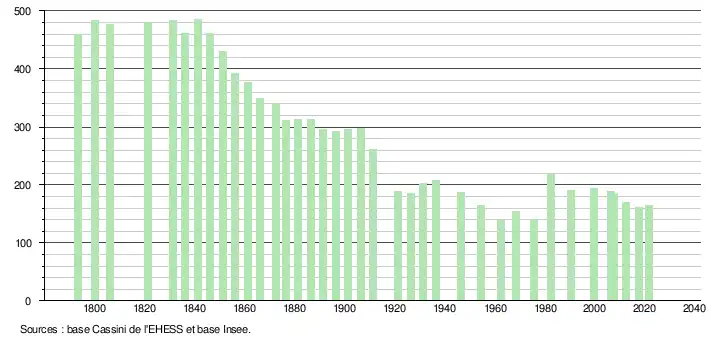 L'évolution du nombre d'habitants est connue à travers les recensements de la population effectués dans la commune depuis 1793. Pour les communes de moins de 10 000 habitants, une enquête de recensement portant sur toute la population est réalisée tous les cinq ans, les populations légales des années intermédiaires étant quant à elles estimées par interpolation ou extrapolation[21]. Pour la commune, le premier recensement exhaustif entrant dans le cadre du nouveau dispositif a été réalisé en 2007[22].