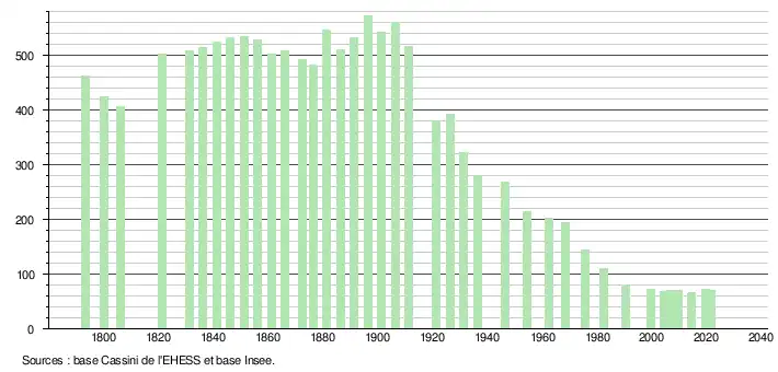 L'évolution du nombre d'habitants est connue à travers les recensements de la population effectués dans la commune depuis 1793. Pour les communes de moins de 10 000 habitants, une enquête de recensement portant sur toute la population est réalisée tous les cinq ans, les populations légales des années intermédiaires étant quant à elles estimées par interpolation ou extrapolation[24]. Pour la commune, le premier recensement exhaustif entrant dans le cadre du nouveau dispositif a été réalisé en 2004[25].