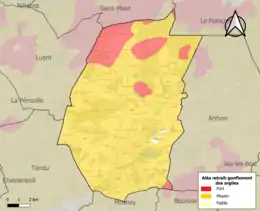 Le retrait-gonflement des sols argileux est susceptible d'engendrer des dommages importants aux bâtiments en cas d’alternance de périodes de sécheresse et de pluie. 99,6 % de la superficie communale est en aléa moyen ou fort (84,7 % au niveau départemental et 48,5 % au niveau national). Sur les 527 bâtiments dénombrés sur la commune en 2019, 523 sont en aléa moyen ou fort, soit 99 %, à comparer aux 86 % au niveau départemental et 54 % au niveau national. Une cartographie de l'exposition du territoire national au retrait gonflement des sols argileux est disponible sur le site du BRGM[23],[24].