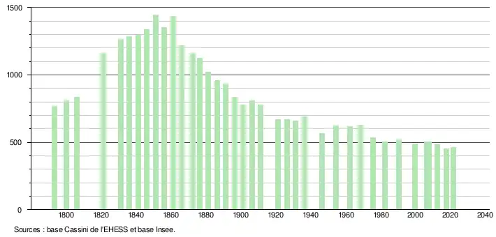 L'évolution du nombre d'habitants est connue à travers les recensements de la population effectués dans la commune depuis 1793. Pour les communes de moins de 10 000 habitants, une enquête de recensement portant sur toute la population est réalisée tous les cinq ans, les populations légales des années intermédiaires étant quant à elles estimées par interpolation ou extrapolation[20]. Pour la commune, le premier recensement exhaustif entrant dans le cadre du nouveau dispositif a été réalisé en 2007[21].