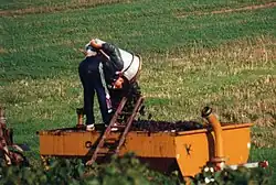 Le porteur peut aussi récolter le raisin des seaux dans une caisse à vendange, qu'il soulève ensuite et porte à l'épaule jusqu'au bout du rang de vigne, où elle sera rangée dans un camion ou une remorque. Cette pratique permet au raisin d'être entassé par petite quantité, et donc d'avoir moins de poids, qui risque d'abimer les grains.