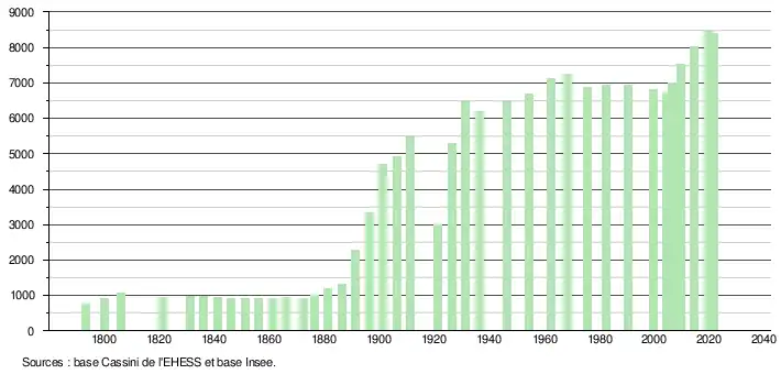 L'évolution du nombre d'habitants est connue à travers les recensements de la population effectués dans la commune depuis 1793. Pour les communes de moins de 10 000 habitants, une enquête de recensement portant sur toute la population est réalisée tous les cinq ans, les populations légales des années intermédiaires étant quant à elles estimées par interpolation ou extrapolation[34]. Pour la commune, le premier recensement exhaustif entrant dans le cadre du nouveau dispositif a été réalisé en 2004[35].