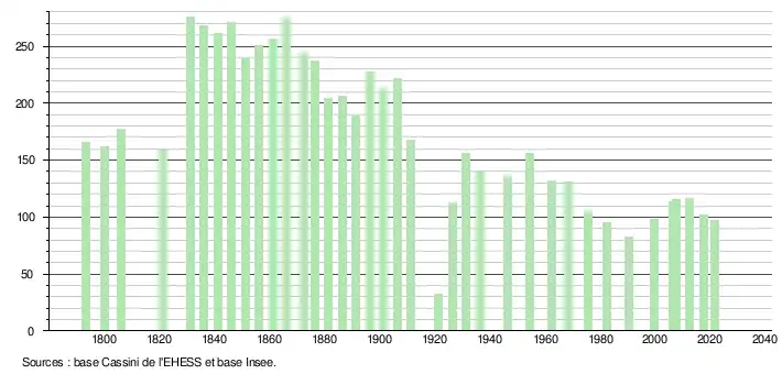 L'évolution du nombre d'habitants est connue à travers les recensements de la population effectués dans la commune depuis 1793. Pour les communes de moins de 10 000 habitants, une enquête de recensement portant sur toute la population est réalisée tous les cinq ans, les populations légales des années intermédiaires étant quant à elles estimées par interpolation ou extrapolation[28]. Pour la commune, le premier recensement exhaustif entrant dans le cadre du nouveau dispositif a été réalisé en 2007[29].