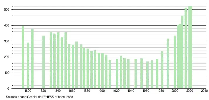L'évolution du nombre d'habitants est connue à travers les recensements de la population effectués dans la commune depuis 1793. Pour les communes de moins de 10 000 habitants, une enquête de recensement portant sur toute la population est réalisée tous les cinq ans, les populations légales des années intermédiaires étant quant à elles estimées par interpolation ou extrapolation[17]. Pour la commune, le premier recensement exhaustif entrant dans le cadre du nouveau dispositif a été réalisé en 2004[18].