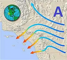 Le brouillard de Santa Ana est un phénomène qui se produit parfois à la fin d'un épisode de vent de Santa Ana le long de la côte sud de la Californie. Lors du Santa Ana la couche inférieure de l'atmosphère, sur deux à trois kilomètres d'épaisseur, est extrêmement sec, même sur les eaux du Pacifique. Quand il cesse, l'humidité venant des eaux sous-jacentes reforme une inversion marine fraîche et humide si les conditions sont favorables. L'air dans la couche marine devient très humide et des stratocumulus marins très bas ou du brouillard se produisent. Si les vents changent de direction de la mer vers la terre avec assez d'intensité, le brouillard marin entre sur les zones côtières[15],[16].