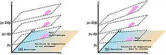 Selon la définition ci-dessus, une masse d'air où la variation de température avec l'altitude est la même partout n'aura aucun vent thermique. Le vent sera le même à toutes les altitudes, c'est ce qu'on appelle une masse d'air barotrope. Par contre, lorsqu'il y a une variation de la température moyenne quand on se déplace selon x ou y, cela implique que le vent variera avec l'altitude et c'est alors une atmosphère barocline[5].